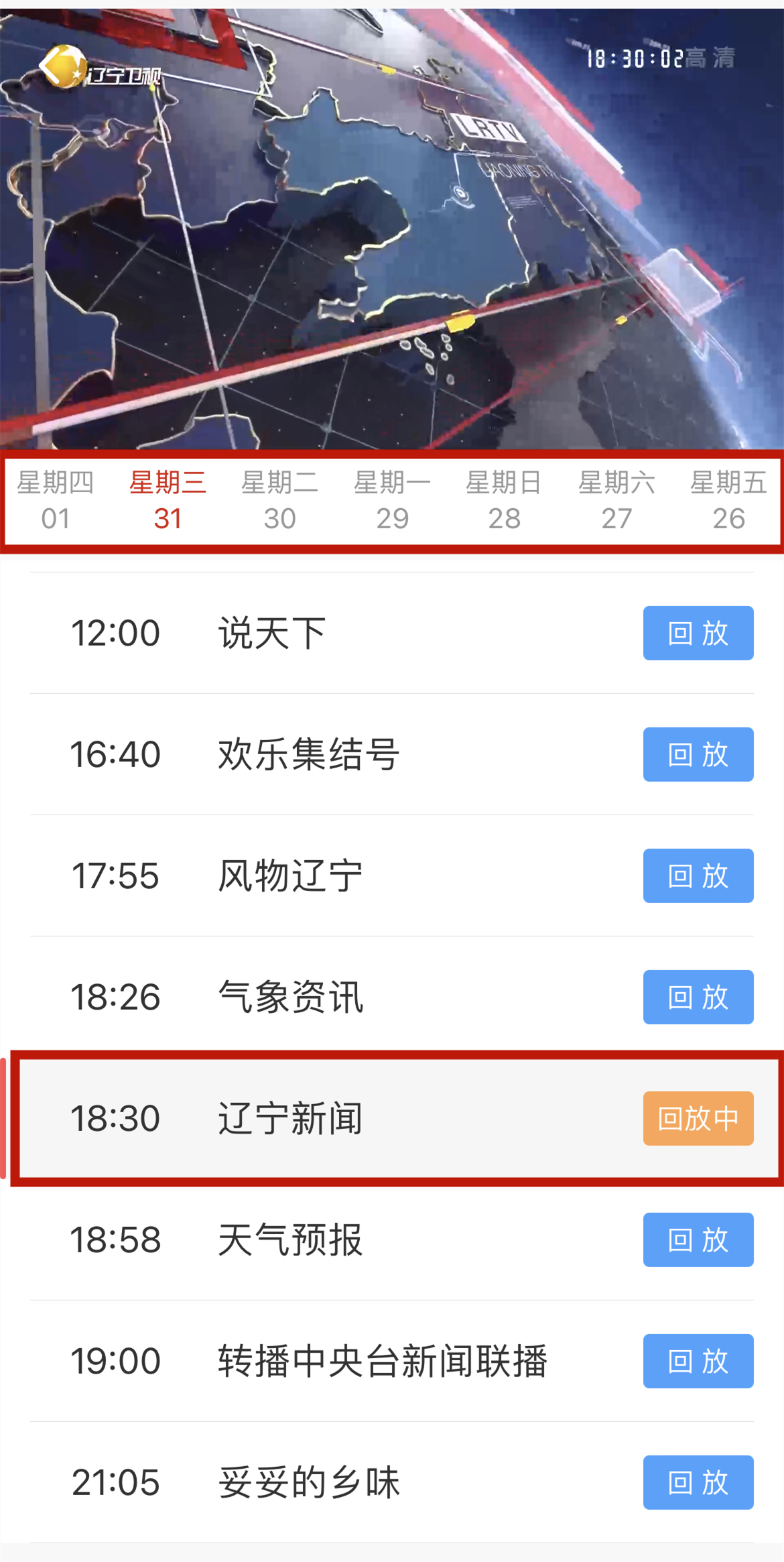 2、每晚18:30“辽宁卫视频道”直播《辽宁新闻》,同时,上方可选择日期收看《辽宁新闻》当天回放