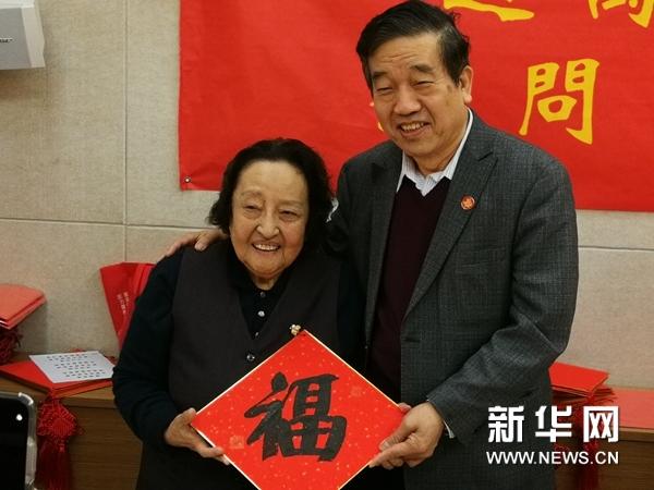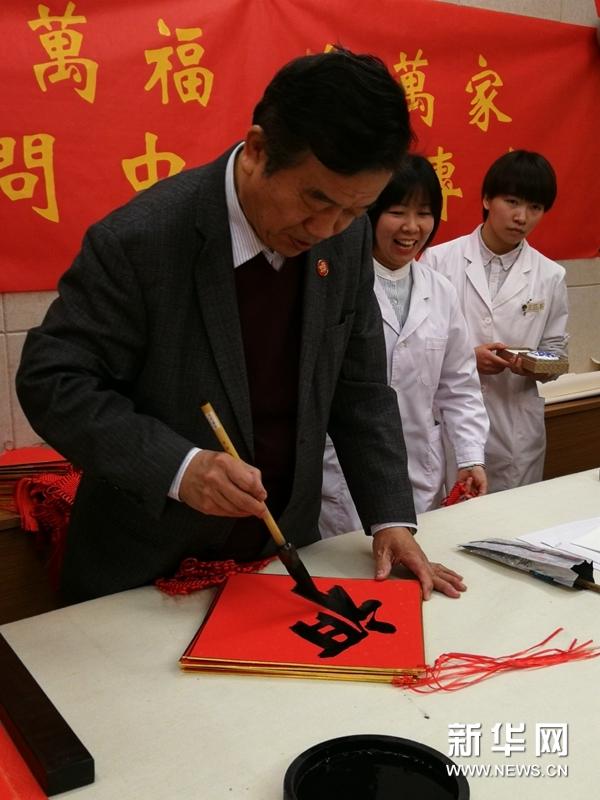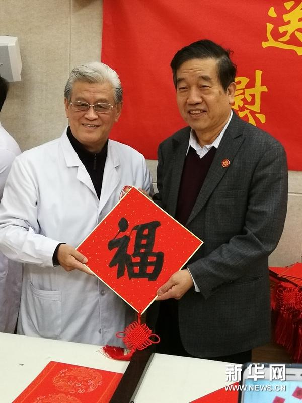 一早,书法家们就顶着寒风来到现场,顾不上休息就铺开笔墨,开始了创作。一会的时间,一张张饱含着对新年美好祝愿的“福”字和春联被送到医师们的手上。苏士澍到场后,立刻就开始挥毫泼墨为医务工作者们送“福”。在得知年近90岁的柴嵩岩医师和一些老医师们仍然在一线为广大患者诊病服务的时候,苏士澍非常感动,专门为老专家们一一送上祝福并合影留念,感谢这些白衣天使为了人们的健康所做出的巨大贡献。在“送福”的同时,艺术家和老专家们还就书法艺术和中医文化进行了探讨和交流。一些前来诊病的患者闻讯也陆续参加到活动中,从艺术家们手中接过新春的祝福,现场洋溢着一片喜悦的气氛。
