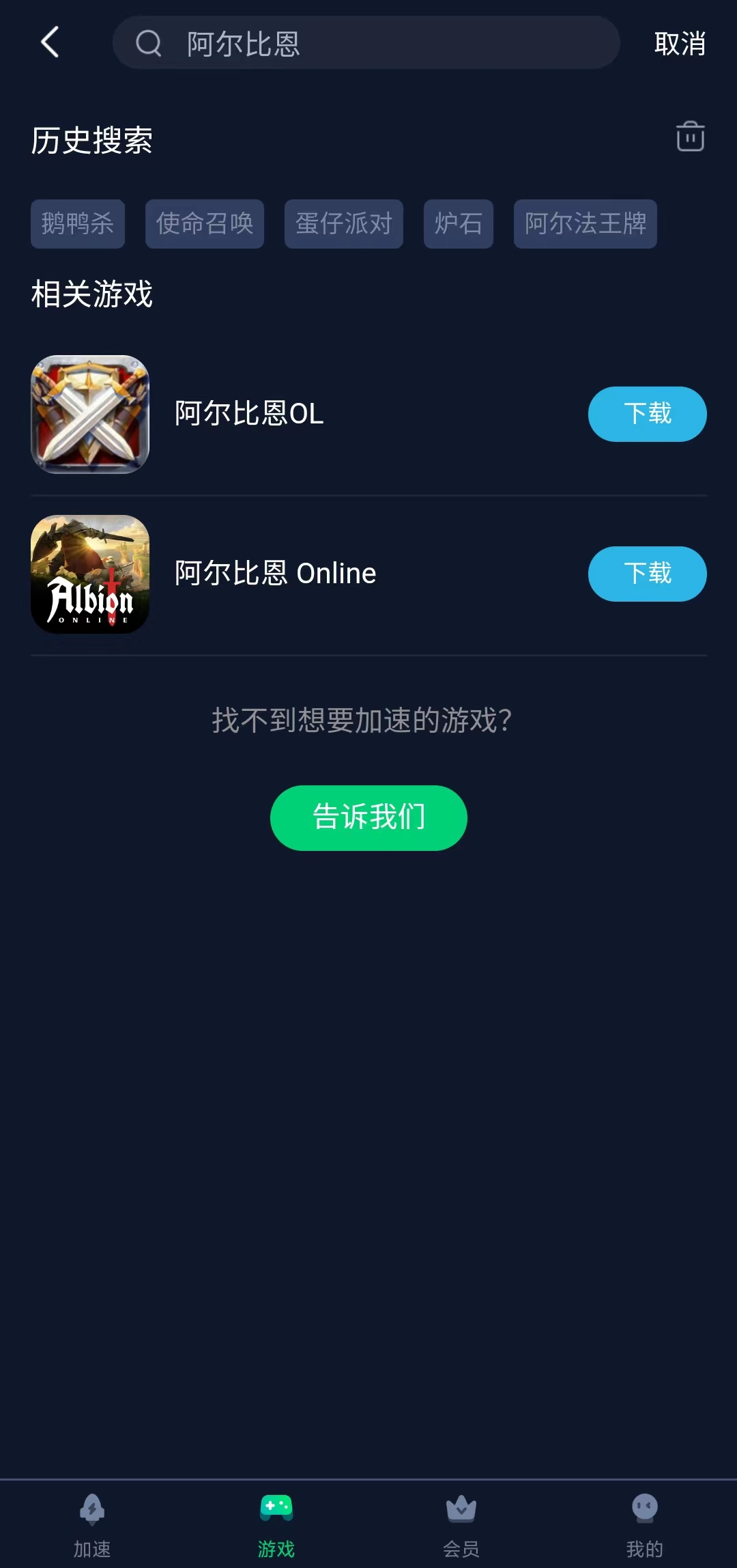 迅游手游加速器APP主要功能是加速,所以下载好进入迅游手游APP的时候,界面展示的是加速功能。此时玩家们只需要点击APP下方的游戏选项,就可以进入到游戏资源界面了。该界面游戏资源非常丰富,不仅仅有国服游戏,更是有丰富的国际服、外服资源。如果玩家们没有找到阿尔比恩OL手游的话,这里建议直接点击右上角搜索功能,输入阿尔比恩OL后就能找到游戏资源了。