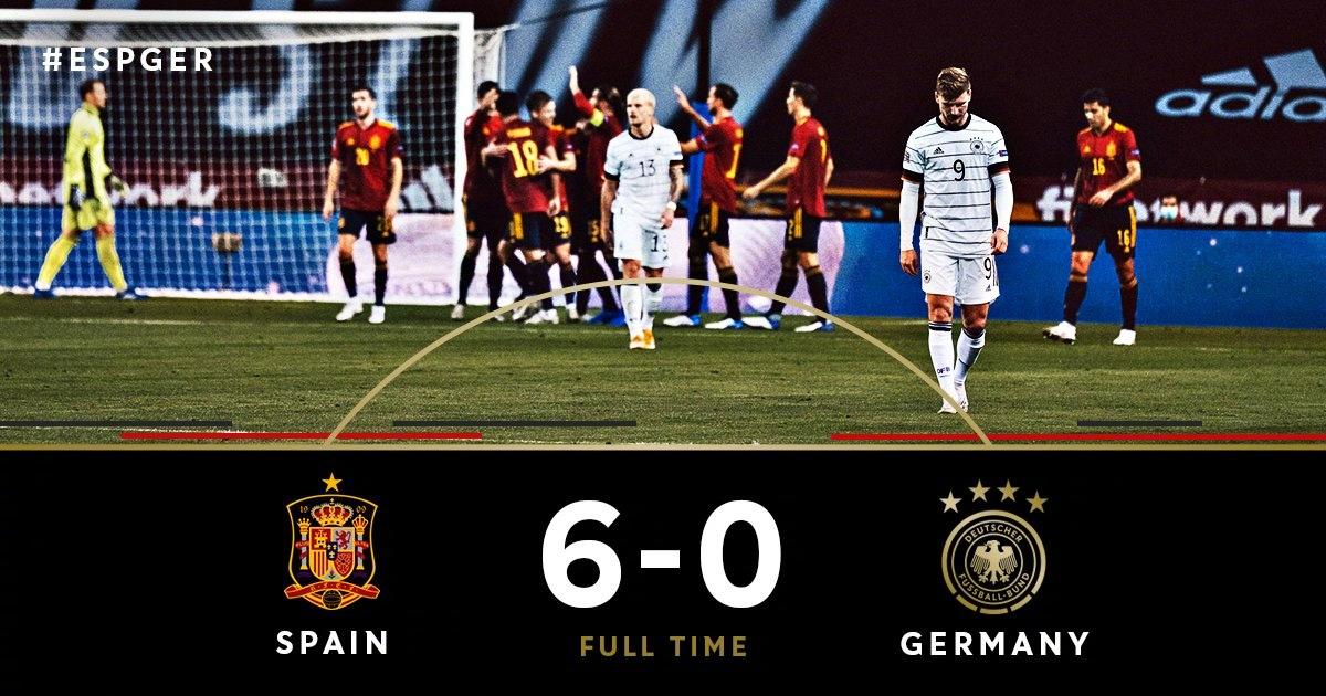新京报讯 北京时间11月18日,欧国联A4组第6轮,西班牙主场6比0狂胜德国,反超对方夺得头名,晋级决赛圈4强。德国队则遭遇史上正式比赛最惨失利。此役,莫拉塔头球破门,费兰·托雷斯完成帽子戏法,罗德里头球建功,奥亚萨瓦尔推射破门。