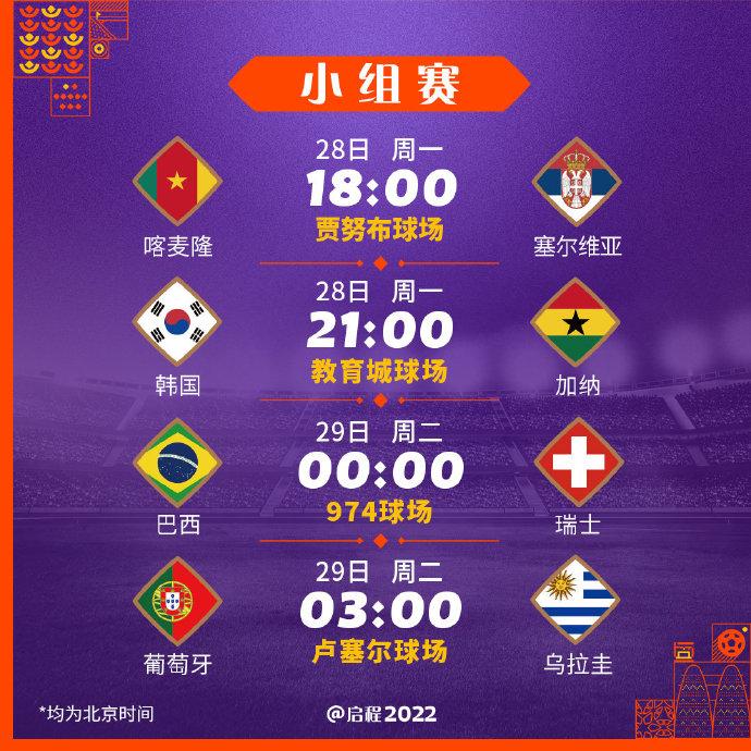 G组18:00喀麦隆对阵塞尔维亚;H组21:00韩国对阵加纳;G组00:00巴西对阵瑞士;H组3:00葡萄牙对阵乌拉圭。