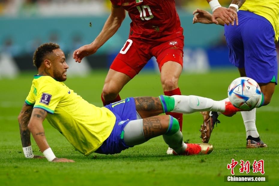 图为巴西队球员内马尔倒地传球。中新社记者 富田 摄