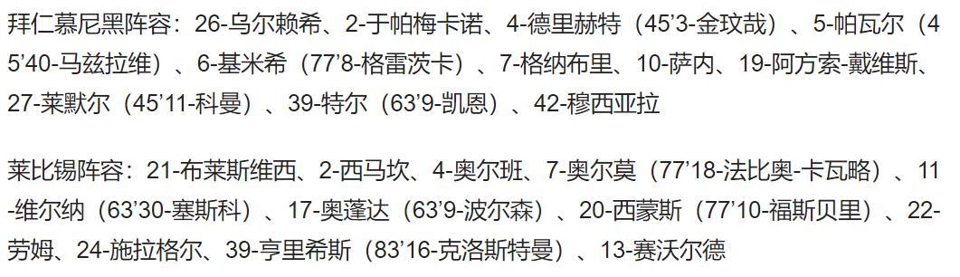 第70分钟,莱比锡获得了一次打空门的机会,金玟哉及时回防将球铲出底线。第75分钟,科曼在禁区右侧内切后左脚抽射,莱比锡门将把球扑出。