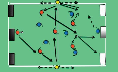 指导要点:控球方每人只能触球2次,即一停 一传,利用人多的优势,快速传接球,接球时要灵活转身或变向寻找传球的路线及射门的角度;以传地滚球为主,尽量不传空中球。