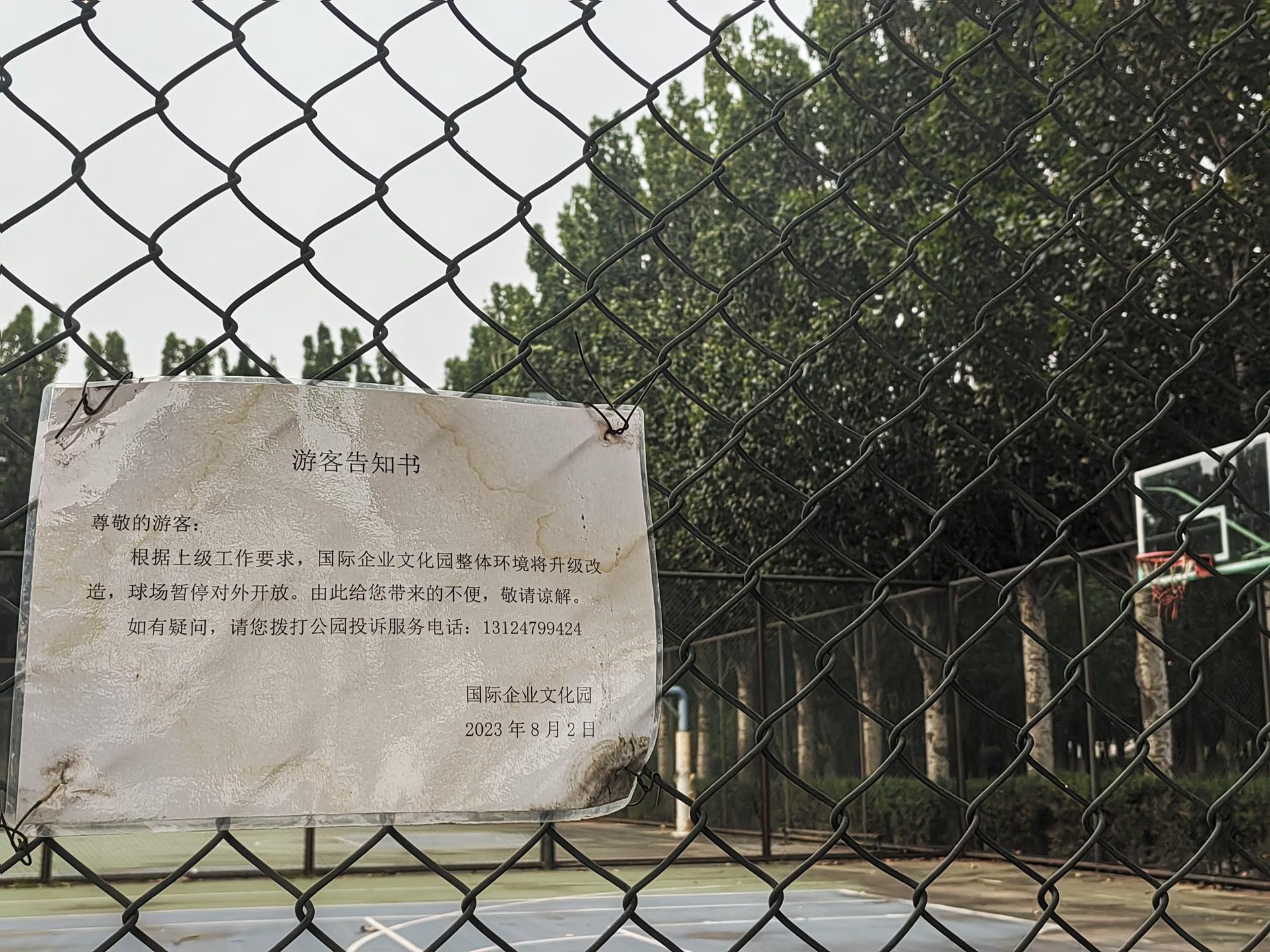 场地之所以关门,并非没有解释。在篮球场、足球场的一些围网上,张贴着一份“游客告知书”。其中写明,“根据上级工作要求,国际企业文化园整体环境将升级改造,球场暂停对外开放。由此给您带来的不便,敬请谅解。”