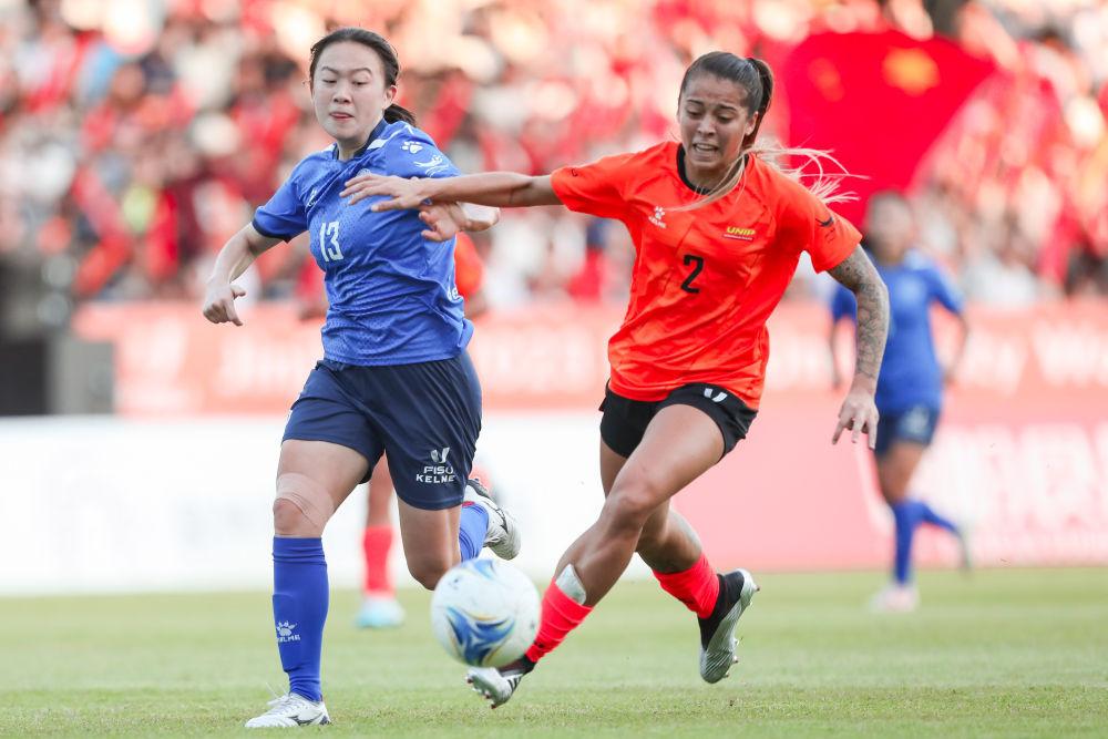 2023年10月31日,2023年国际大体联世界杯赛中,北京师范大学队球员邹梦瑶(左)与保利斯塔大学女足球员迪奥凡娜争抢。新华社发(赖进财 摄)