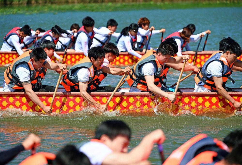 5月26日,2024天开津南园京津冀大学生龙舟邀请赛在天津市海河教育园区大学生水上运动中心举行,来自北京大学、中央民族大学、南开大学等六所高校的学生龙舟队伍奋楫竞渡。新华社记者 赵子硕 摄
