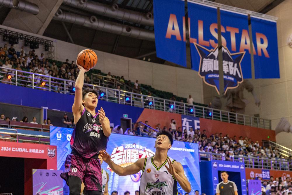 5月25日,在重庆举行的2024中国大学生篮球一级联赛(CUBAL)全明星赛中,精英队球员谢智杰(左)在比赛中上篮。新华社记者 黄伟 摄
