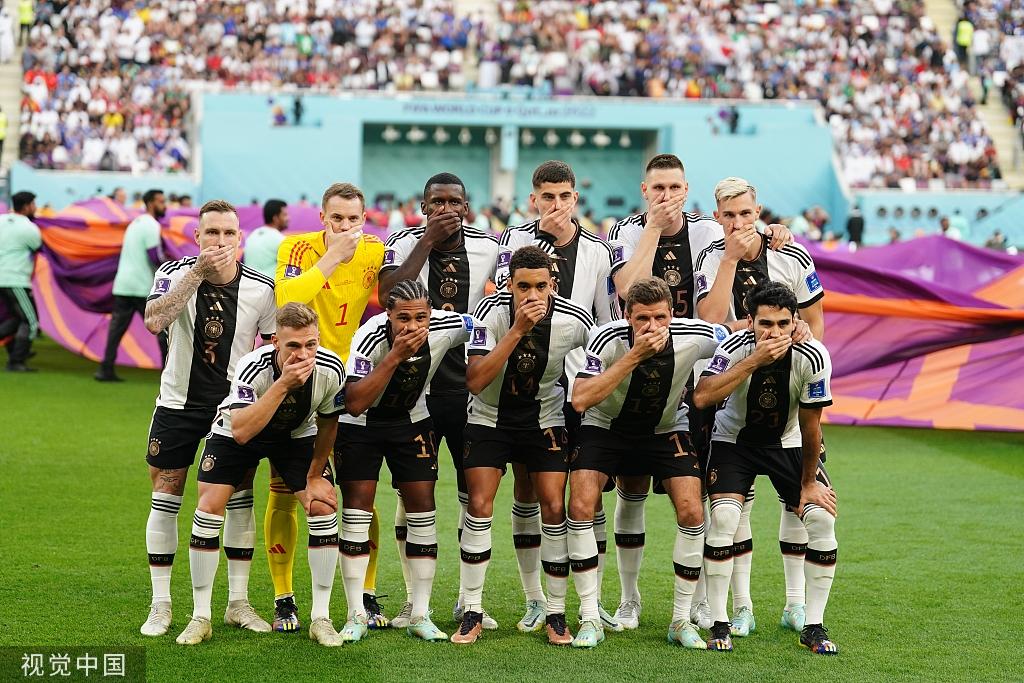 在小组赛第一轮比赛中(11月24日),德国队在对阵日本队赛前做出捂嘴手势,抗议国际足联禁止他们佩戴“One Love”彩虹袖标向LGBTQ群体表示支持,他们也是本届世界杯目前唯一一支公开反对该规定的球队。