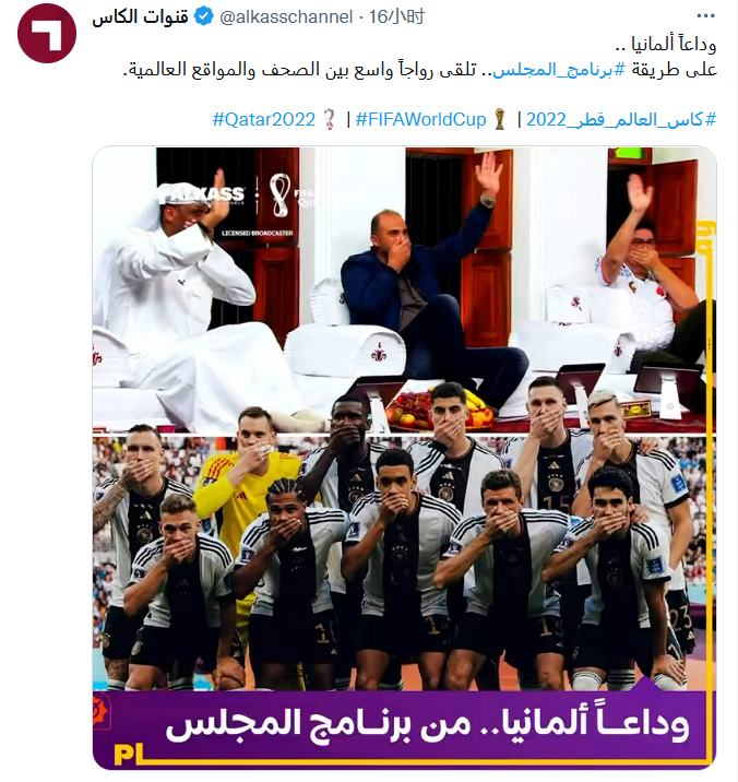 (观察者网讯)3日,卡塔尔AlKass体育频道的官方推特发布了一则“内涵”德国队的节目视频:得知德国队在世界杯被淘汰的消息后,全场嘉宾都做出了一只手捂嘴,另一只手挥别再见的动作。