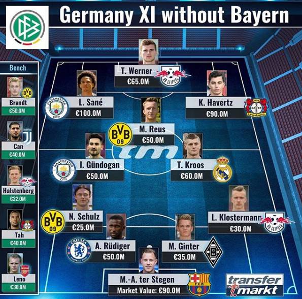 对此,德国转会市场网站列出了“无拜仁”德国国家队阵容,萨内、克罗斯、特尔施特根领衔。