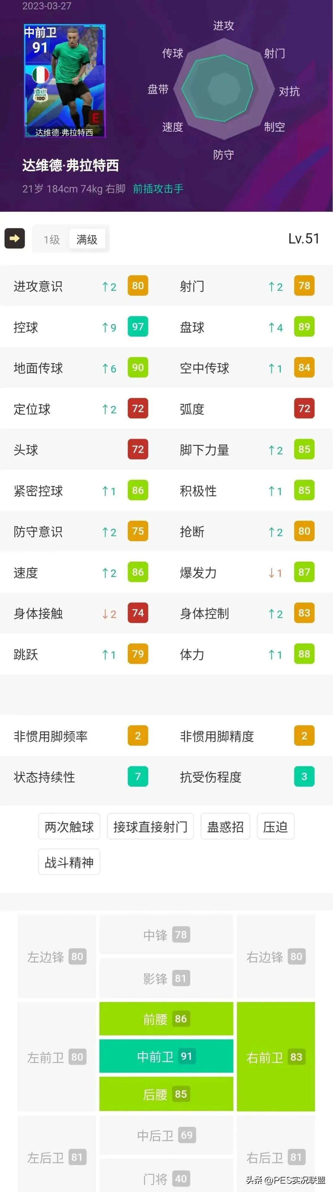 球员简析:弗拉特西(精)虽然拥有184cm/74kg的模型,但对抗能力仅是边锋水平,同时他也不具备天花板级别的双速或绝对爆点能力,因此实力上限不会太高,但可作为替补使用。