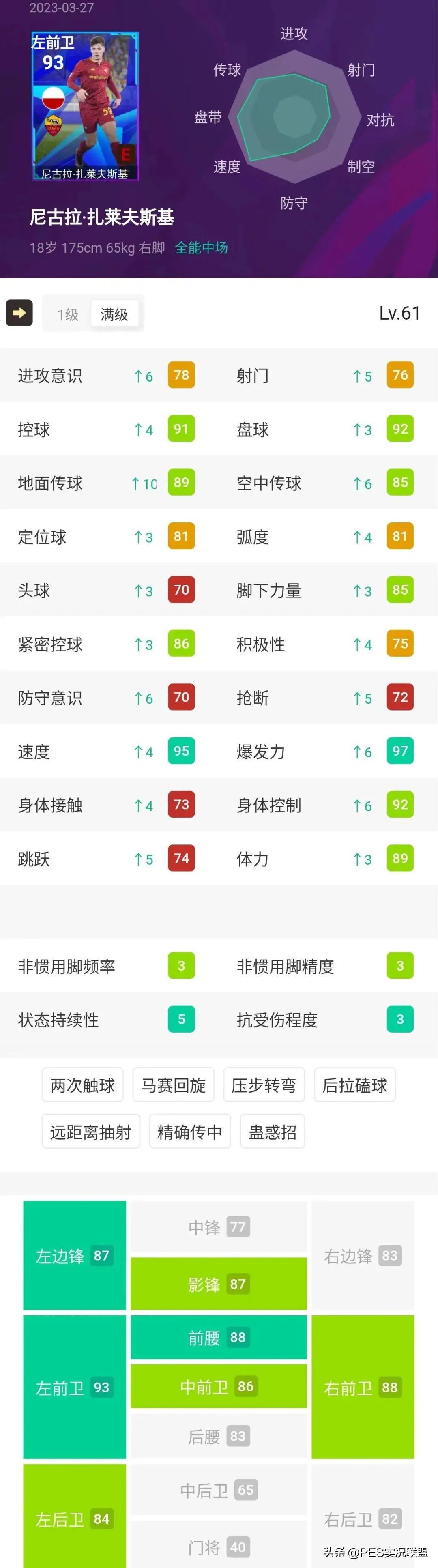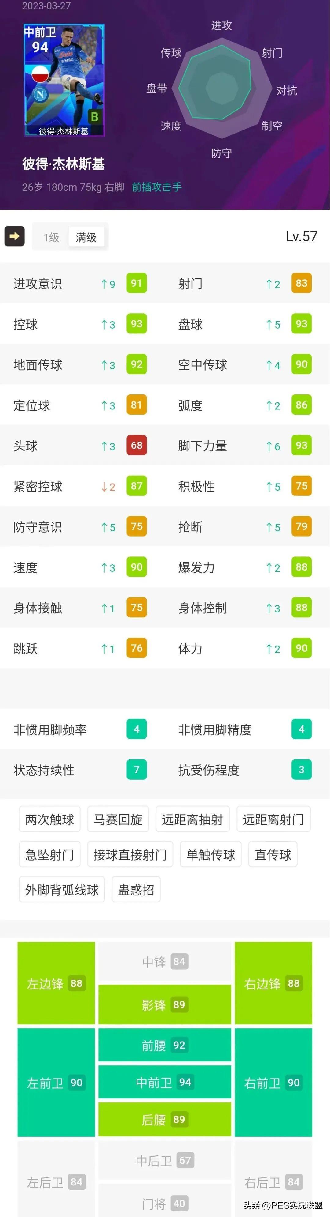 球员简析:杰林斯基的特点类似于身体弱化版的时刻罗布森,既是游戏所青睐的前插攻击手风格,又是拥有超强位置适应性的中前场万金油,并且在此基础上还兼具44脚(无逆足)和7状态持续性,整体实力大概率准毕业起步,缺少顶级前腰的玩家可以考虑抽取。