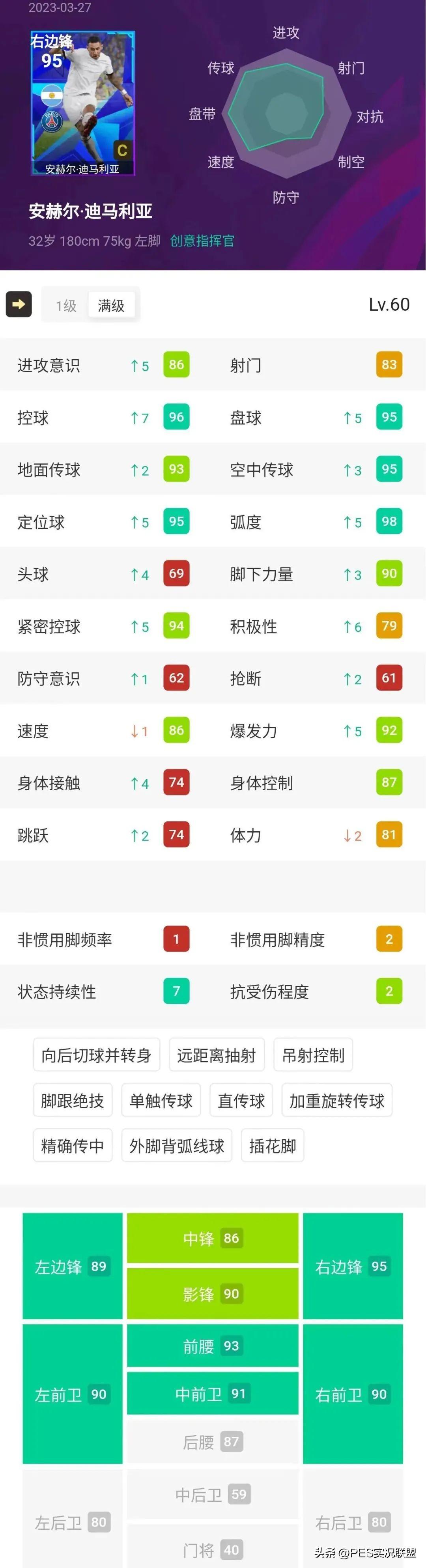 球员简析:迪马利亚(精)一直不火的原因,主要还是风格受限 。而且他跟顶级边锋比起来,双速只是一般水平,导致放在右路前插和内切的效果不是太好。所以抽到的玩家莫不如把他放在左路,利用顺足发挥助攻的特长。
