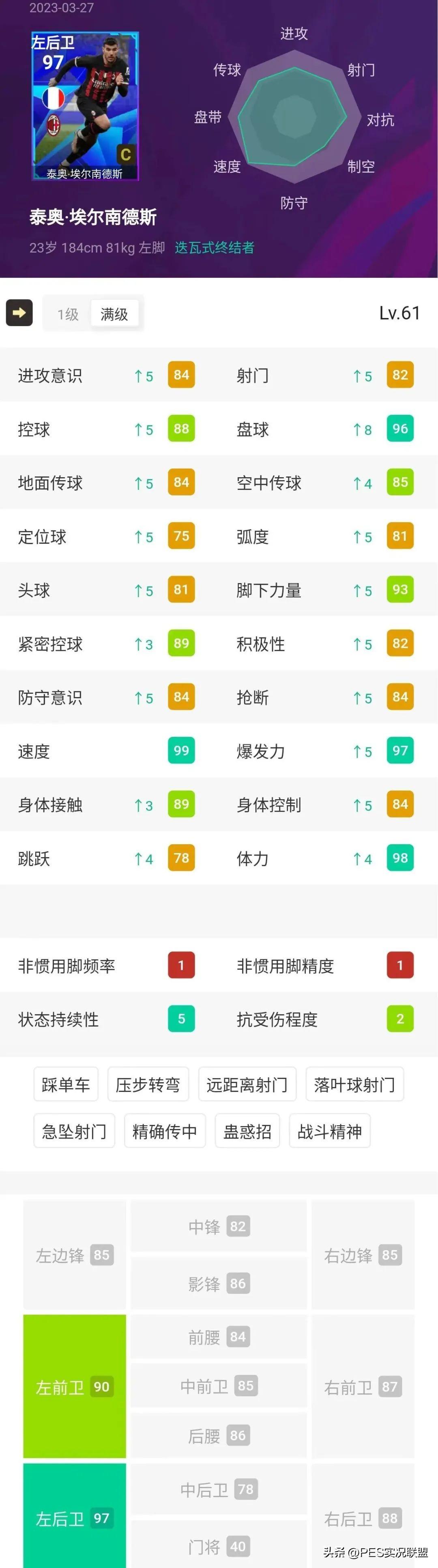 球员简析:泰奥(精)的属性已经碾压史诗卡福,但除了速度和模型之外,整体特点仍是攻强守弱,风格又是比较激进的跌瓦式终结者;并且他的逆足精准度较差,传球前需调整顺足不能一脚出球,导致助攻水平也有限,因此虽然评分很高,但非队套玩家抽取的意义比较一般。