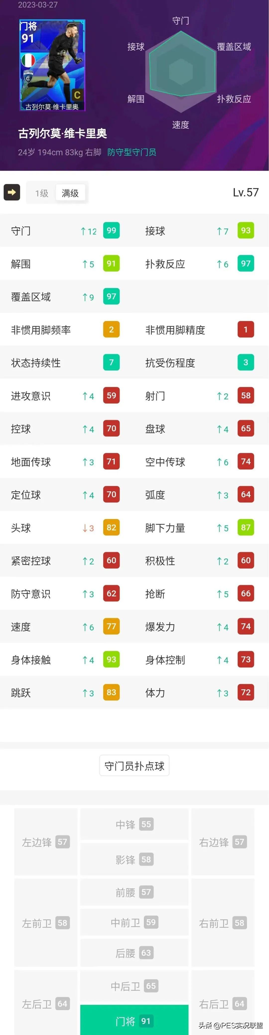 球员简析:维卡里奥(精)自身的实力可用,但位置竞争力不是很强。如果不组队套,同风格的普卡库尔图瓦综合素质更强;如果组意大利队套,不同风格的唐纳鲁马也要更好。所以当前入手他的意义还是作为替补门将过渡,长期来看可以替代维卡里奥(精)的人选会很多。