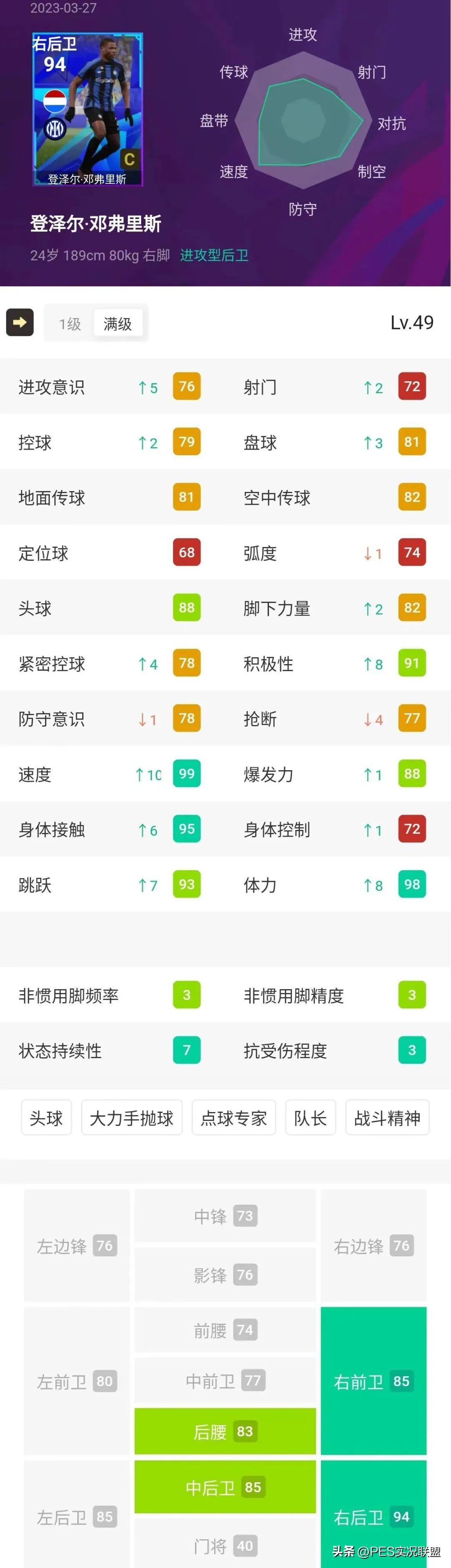 球员简析:邓弗里斯(精)是中卫模型的边后卫,对抗能力是碾压大多数同位置球员的存在,但以当前版本更加注重边后卫防守能力的特点来看,属性攻不强守还弱的邓弗里斯(精)很难成为时下边后卫中的佼佼者。因此抽到他虽然不亏,但报以过高期待势必不太现实。