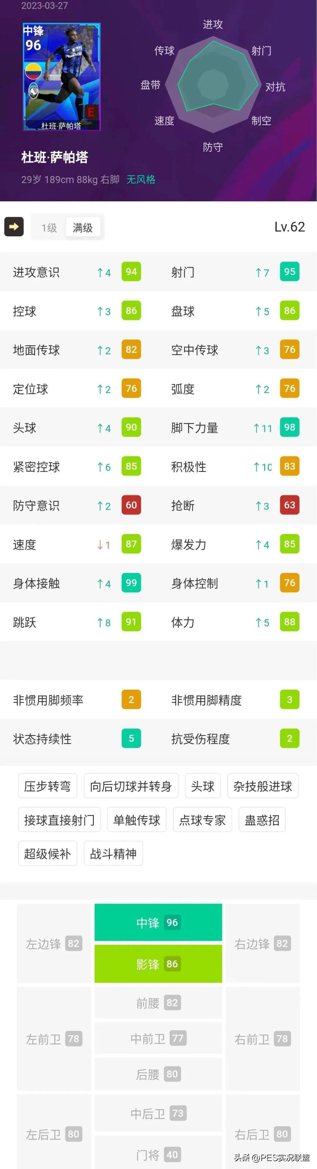 球员简析:萨帕塔(精)属于典型的坦克式中锋,拥有高大模型的同时对抗达到满值,并且还兼具87的速度,攻击和射术也都在线,实力自然不差。