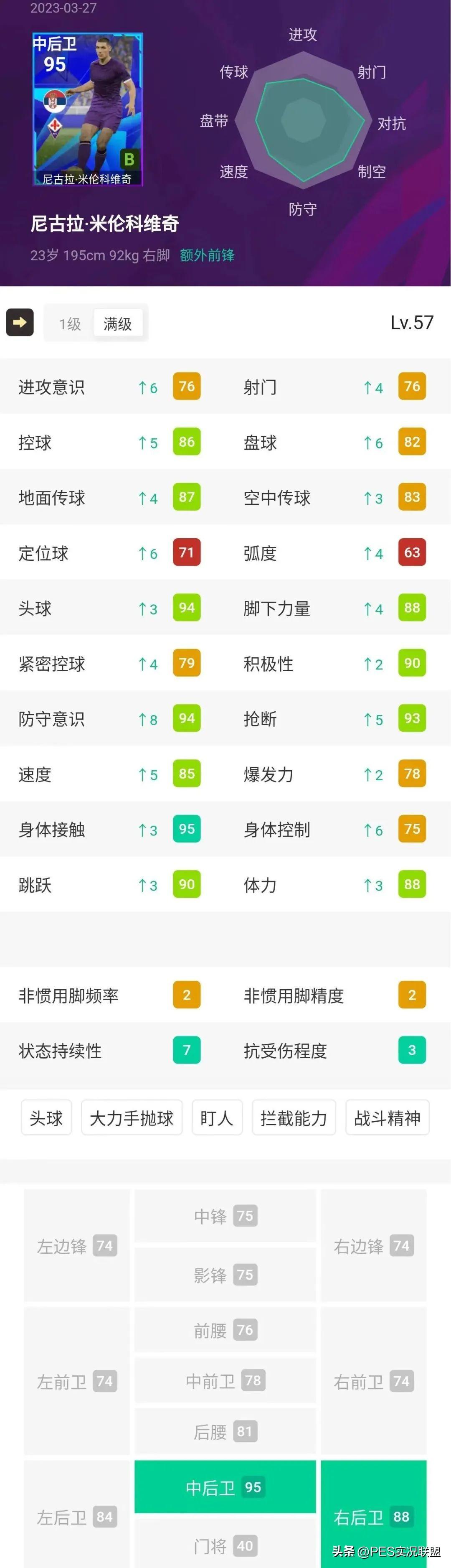 球员简析:米伦科维奇(精)曾经是国服最强级别的中后卫之一,现在虽有一定削弱,但实力依然强悍。既没有状态持续性的短板,也不存在出球方面的问题。在拥有195cm/92kg高大模型的同时,还兼具90+的双防和85的满级速度。