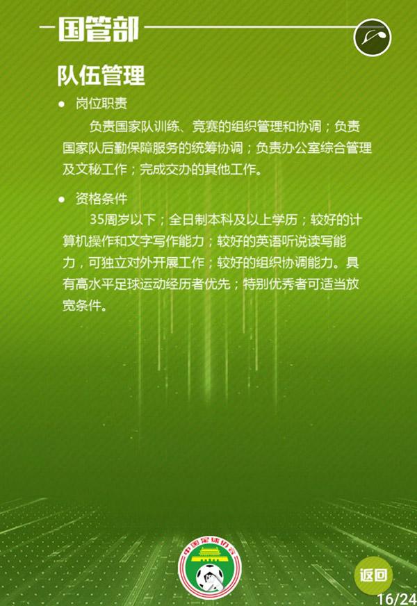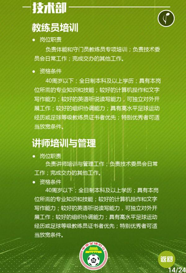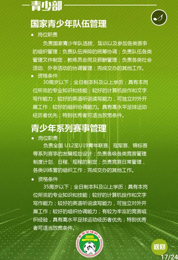 而本次招聘涉及13个足协部门30个岗位,技术部、竞赛部、青少部、国管部都有招聘名额。