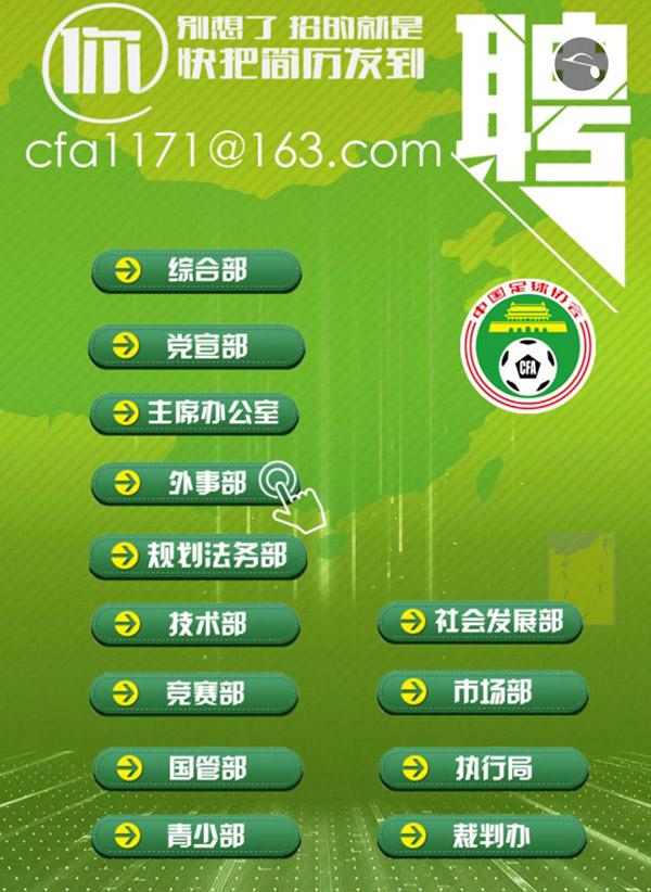 2016年年底,中国足协还面向社会招聘起了实习生。规划法务部,财务办,综合部,外事部,社会发展部,裁判办,技术部,竞赛部共8个部门需要补充新鲜血液。