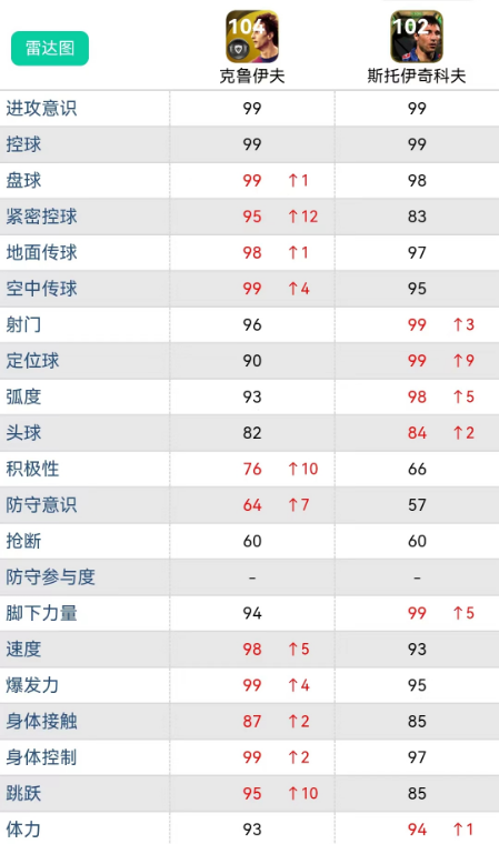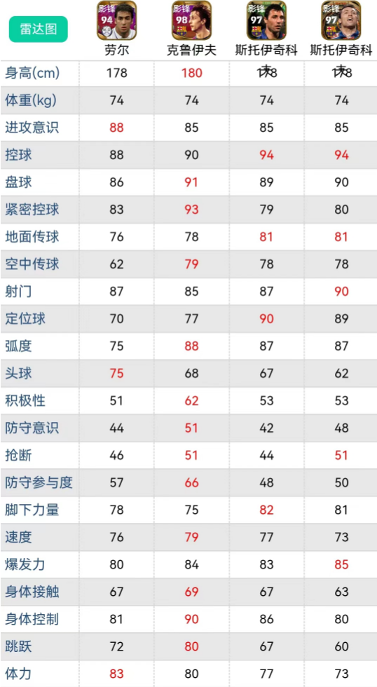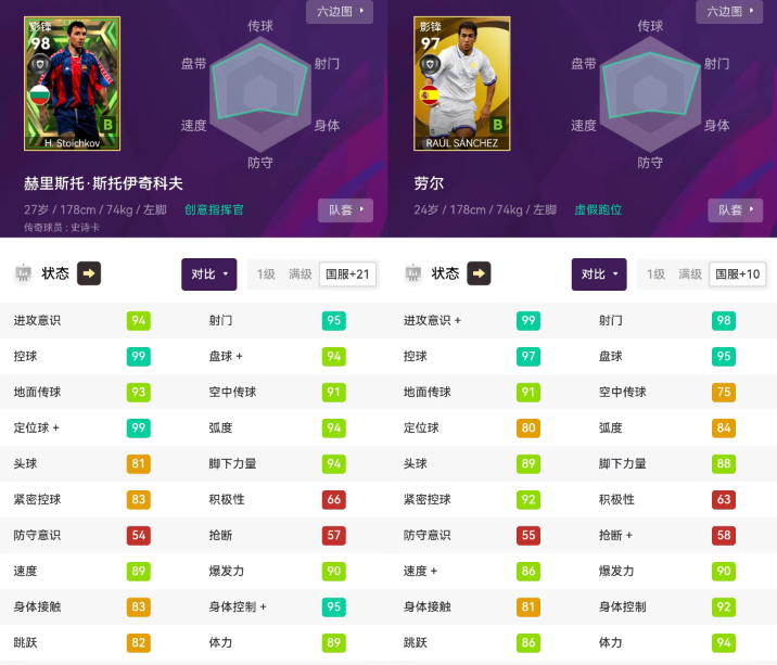 他俩一般B状态下,多项数据也拉满了,对比还是很明显的。斯托伊奇科夫的射门精度和力度的都能拉满,所以打影锋和拉边都可以。