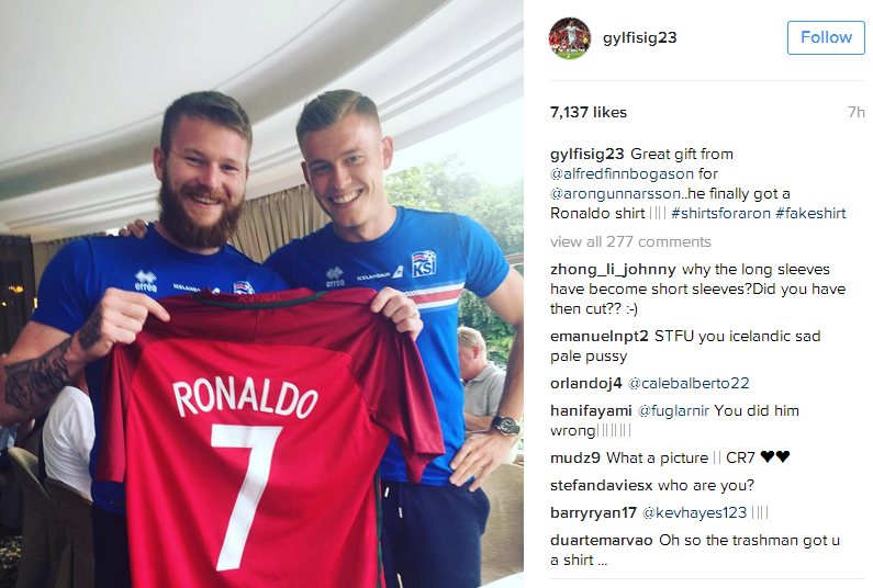 冰岛与葡萄牙一战结束后,冰岛队长古纳尔森被镜头捕捉到想与C罗交换球衣,不过C罗对他说了一句什么,并没有当场给他球衣。赛后有媒体称C罗对古纳尔森说的是“你是谁啊”,但随后当事人古纳尔森辟谣,说C罗只是说要去球员通道再换球衣。