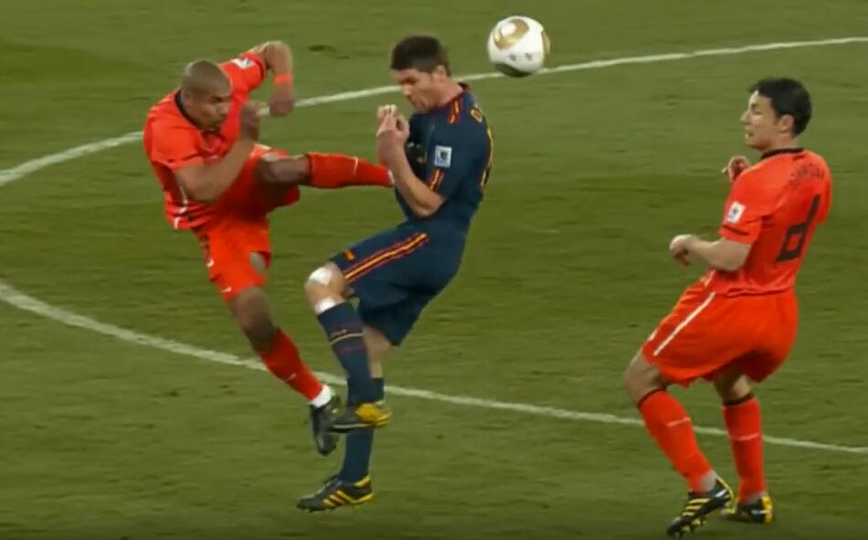 令人难以置信的是,南非世界杯决赛中,德容在飞踹哈维-阿隆索的胸口之后,这位荷兰中场仍旧留在场上继续战斗。
