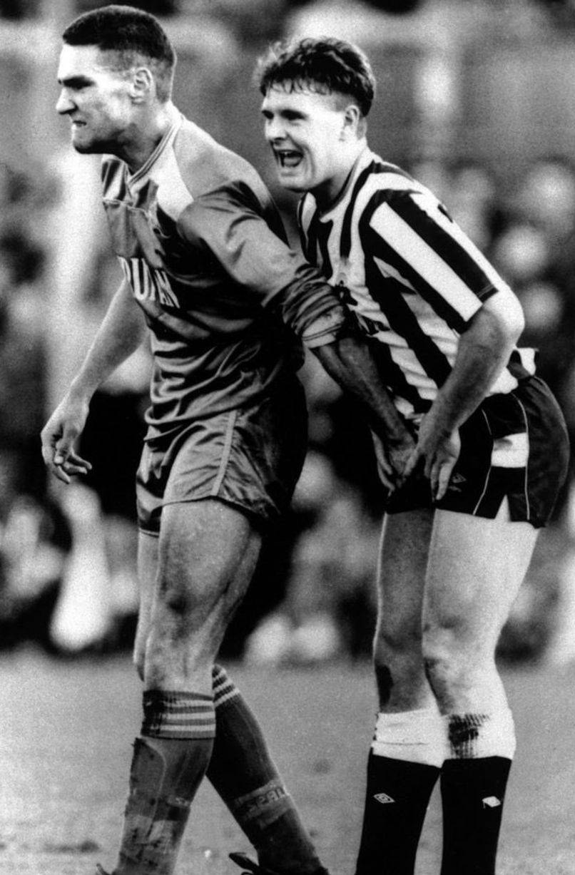 这是足坛有史以来最具标志性的图片之一。温布尔登球员维尼-琼斯站在加斯科因身前,反手一把抓住了身后纽卡斯尔新星的要害部位。真是看着就疼。