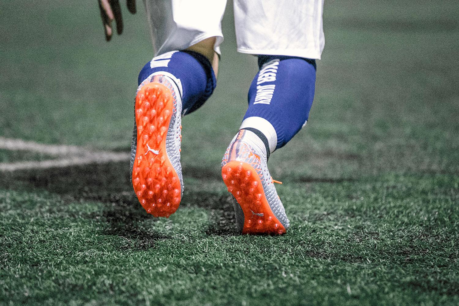 PUMA FUTURE战靴在更换为针织材质鞋面之后(上一代和这一代),球鞋的宽度似乎变瘦了,而JP270尺码的FUTURE 4.1 MG上脚之后觉得长度稍稍偏长,两相综合反倒成了比较合适的尺码选择。所以在尺码选择上,小编会建议普通脚型的EZer按照以往球鞋的正常尺码来选择,初上脚会感觉比较紧,但完全可以通过实战撑开。宽脚和高脚背的EZer一定要试穿,鞋面定型很好,脚型不合适可能会比较难受。