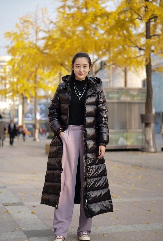 长款羽绒服的魅力任何人都拒绝不了,小姐姐的搭配方法很简单,搭配理念通俗易懂。黑色修身内搭搭配亮面长款羽绒服,这是一款任何人都可以参考的穿搭案例,如果你感觉上半身太单调,可以适时的配上一件深色系衬衫。下半身选择了一件藕粉色拖地休闲裤,宽松拖地的版型穿起来有种维多利亚.贝克汉姆的洒脱感。