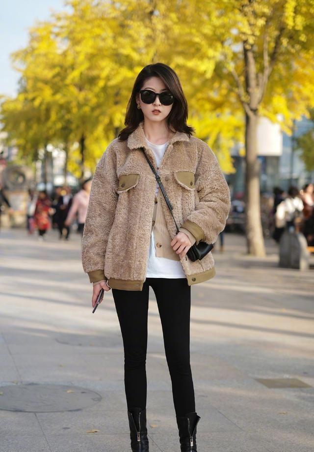 如果你感觉第一件羊毛羔外套太过稚嫩,可以选择相对成熟一点的长毛绒外套。这件类似夹克衫款式的长毛绒外套多了几分正式感,棕色大颗粒的感觉让人忍不住去抚摸。常规款的版型不用担心身材比例被压缩,她内搭选择的是相对简单一点的纯白色圆领卫衣,裤装搭配的是一件纯黑色紧身裤,同样采用了上松下紧的搭配方法,同样给人一种一米八大长腿的既视感。