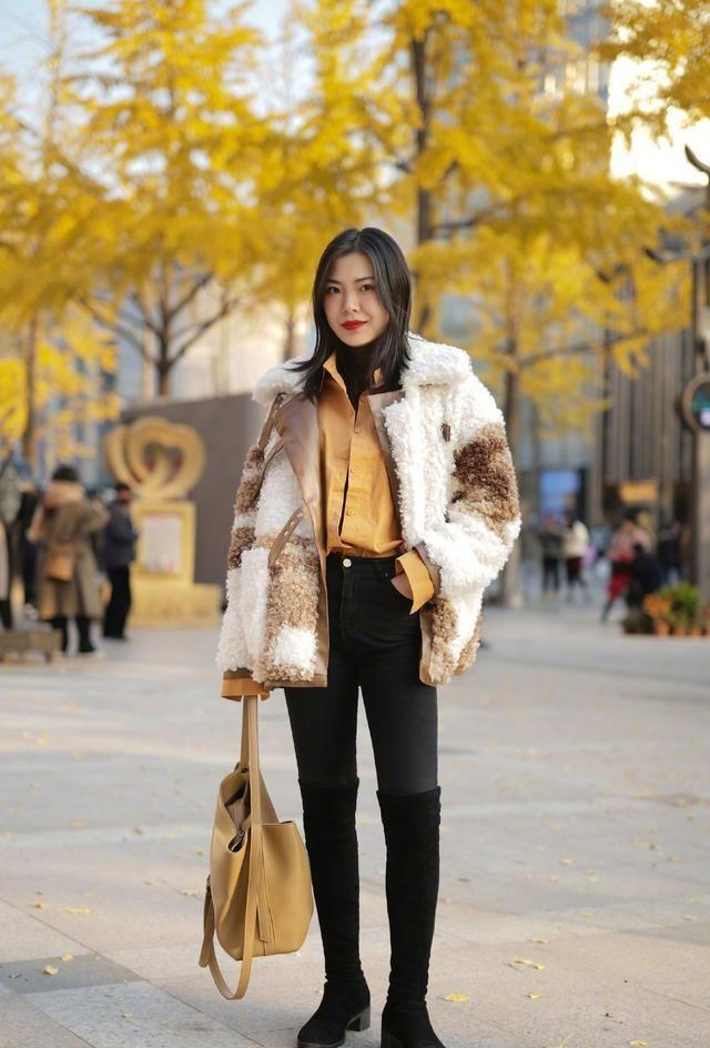 说到冬天穿搭怎样才能显温柔,羊毛羔外套肯定少不了。司空见惯的短羊毛羔外套似乎缺乏新意,很少有人能穿出高贵洋气的感觉。今天介绍的这一款就是在原有温柔的基础上增添了时尚元素,卷卷的长毛绒像极了可爱的泰迪卷,衣身颜色搭配的复古又俏皮。内里采用了棕色软PU的面料,隔风又保暖。外套纵然加分,可是到了温暖的室内就要考验内搭的重要性了,小姐姐选择的是同色系撞色搭配,焦黄色衬衫配上黑色高领内搭,通勤风满满。上半身穿搭的臃肿才能凸显出下半身的纤细高挑,黑色修身裤搭配黑色高筒靴女神范十足。