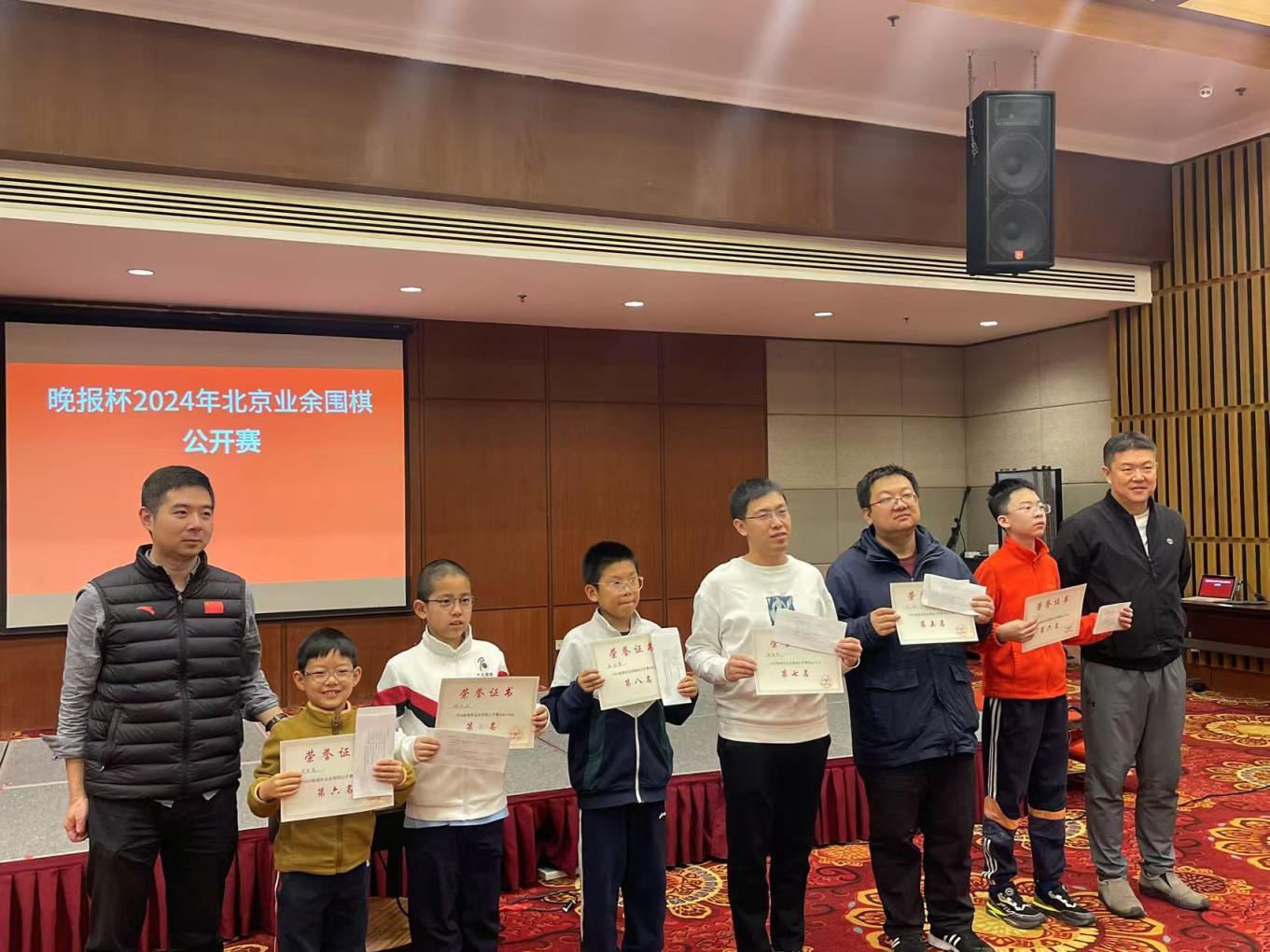 本报讯(记者 李立)近日,由北京晚报主办的“晚报杯”2024年北京市业余围棋锦标赛在北京中成天坛假日酒店落下帷幕,公开组及少年组名次坐定,此外两个组别的前两名尹之上、青文哲、霍宏达和周盐,以及两名特邀棋手白宝祥、汪文琪共6人将组成北京队,参加明年举行的第38届“晚报杯”全国业余围棋锦标赛。