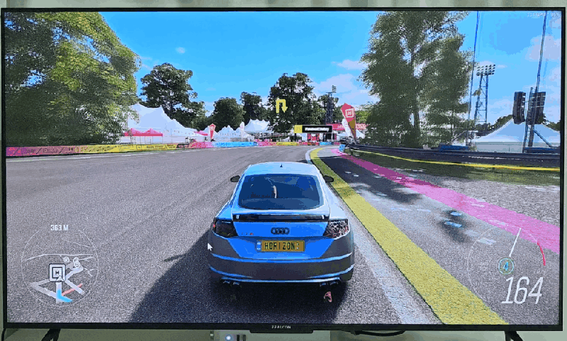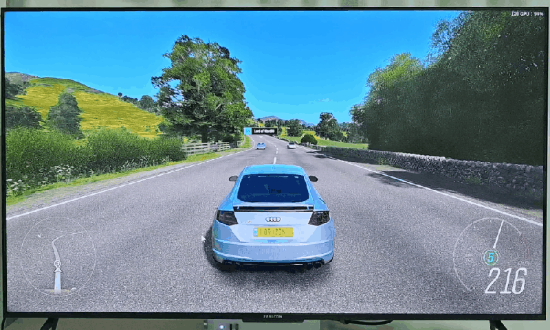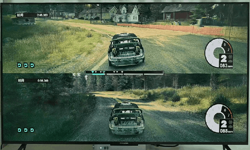 尘埃3已经是2011年推出的游戏了,使用AMD 5000系列的甜点卡,即使分屏也能抱持4k分辨率和高刷新率。电视具备高刷新率的优势是非常明显的,在高速转弯过程中不会出现画面撕裂等状况。能感觉到画面更为顺滑,没有迟滞卡顿。