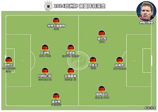 经过数场高质量热身赛的磨砺,德国的主力阵容浮出了水面。诺伊尔的出场顺位在特尔施特根之前,在其身前的是基米希、约纳坦-塔、吕迪格和米特尔施泰特,安德里希和克罗斯搭档双后腰,京多安在中场和锋线之间游弋,维尔茨和穆西亚拉需要覆盖肋部和边路的空间。由于菲尔克鲁格的身体状态难以承受90分钟高强度比赛的消耗,哈弗茨目前依然是纳格尔斯曼在中锋位置的首选。