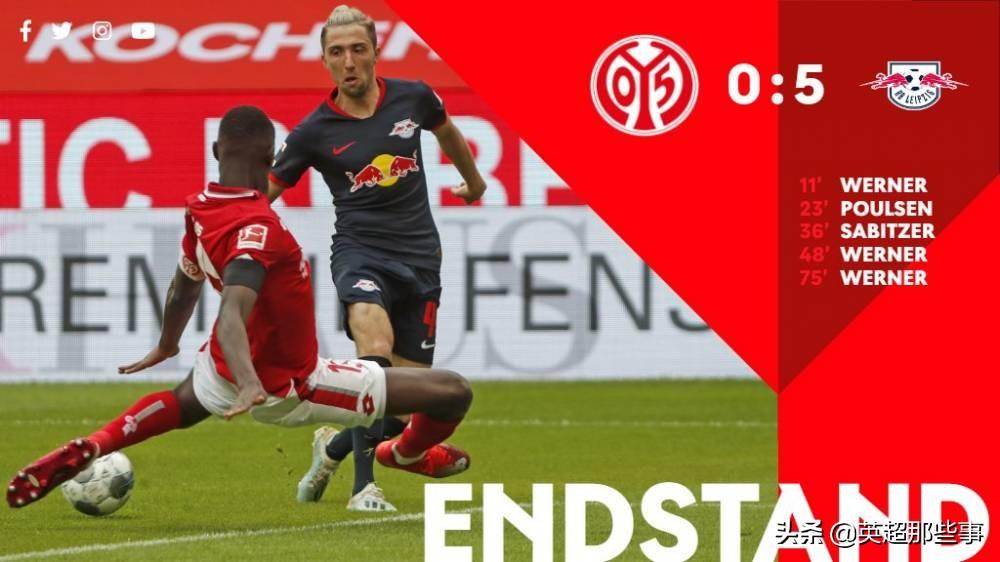 今天晚上的德甲第27轮,上一轮狂轰20多脚却被弗赖堡逼平的莱比锡,将怒气彻底撒在了美因茨身上,他们上半场轰进3球,下半场维尔纳再进2球完成帽子戏法,最终客场5-0横扫美因茨。有趣的是,继上一轮沙尔克被“04”之后,这一次,美因茨队徽上的“05”字样也“显灵”了。