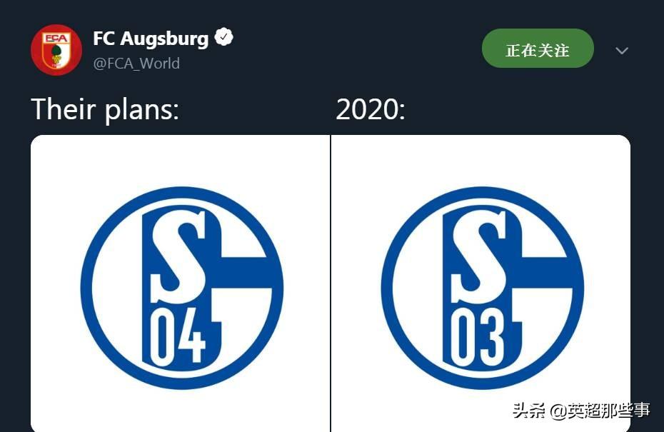 上一轮的鲁尔区德比,多特蒙德主场4-0大胜沙尔克04,4-0的比分和沙尔克04队徽上“04”的字样,相得益彰,沙尔克04也遭到了球迷们的一番调侃。本轮比赛中,沙尔克04主场0-3输给奥格斯堡,赛后奥格斯堡的官方又调侃了一下沙尔克04,这次变成了沙尔克03了。