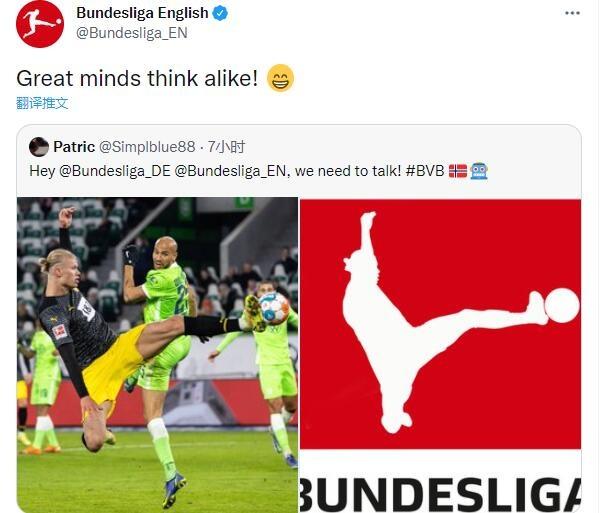 德甲官方账号转发了这条推文,并对这个版本的logo表示认可:“英雄所见略同。”