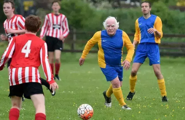 这位82岁的老爷爷Dickie Borthwick还活跃在绿茵场上,他12岁开始踢球,业余踢球已经近70年。