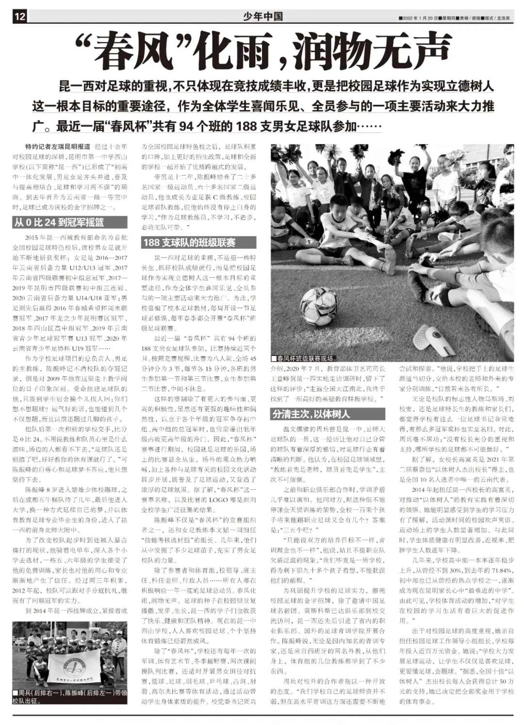 温文儒雅的周兵曾是昆一中、云师大足球队的一员,这一经历让他对自己分管的球队有着深厚的感情,对足球行业有着清晰的判断。他认为,在校园足球领域里,“教练首先是老师,球员首先是学生”,主次不可颠倒。