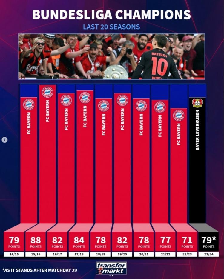 直播吧4月16日讯 德国转会市场统计了德甲近20个赛季的夺冠积分,拜仁12-13赛季的91分为最高,勒沃库森本赛季仍有希望打破这一纪录。