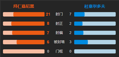 射门:拜仁慕尼黑21次,杜塞尔多夫7次;