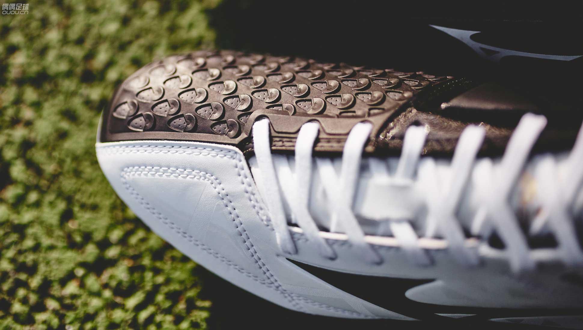 前脚的大面积摩擦区正是回旋击球区,也就是美津浓标志性的Bio Control Panel技术,它能让你找到T90和以摩擦条闻名的猎鹰战靴的感觉。足球鞋的大底采用的是和Ignitus 3 相似的合成材料大底,大底上有12颗异形刀钉以提供更好的抓地力,新产品鞋钉要比其他鞋款的FG稍长一些,因此建议大家一定要在天然草场上使用,换句话说也增加了使用局限性。