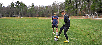 然后我们要用另一只脚的脚外侧推球过人,然后在另一侧接球,现在防守队员已经被甩到身后,你可以加速突破,而他们要转身180度才能回追。