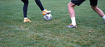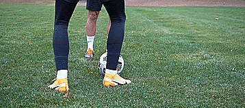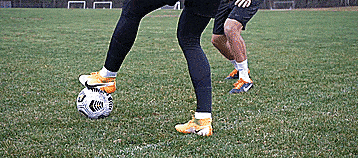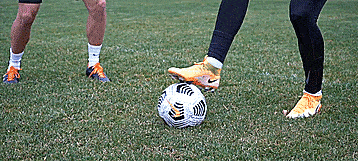 这个训练不管在比赛还是训练中,因为这个动作实在太美妙了。先用我的右脚将球拉过来(具体用哪只脚主要看你的惯用脚),然后用非惯用脚将球磕出,这样右脚就能紧跟着触球摆脱了。