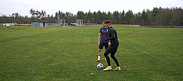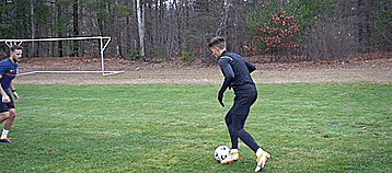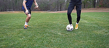 所以我把球放在脚下,我要让防守队员看起来像沿边路突破,我们的身体向前突进,让防守者迈步,就像我们看到的那样,在他的两腿之间创造一个空隙。