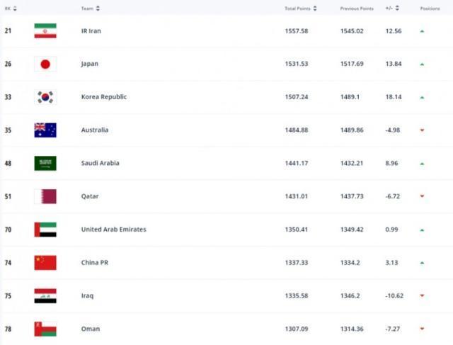 亚洲前十名则为:21-伊朗、26-日本、33-韩国、35-澳大利亚、48-沙特、51-卡塔尔、70-阿联酋、74-中国、75-伊拉克、78-阿曼