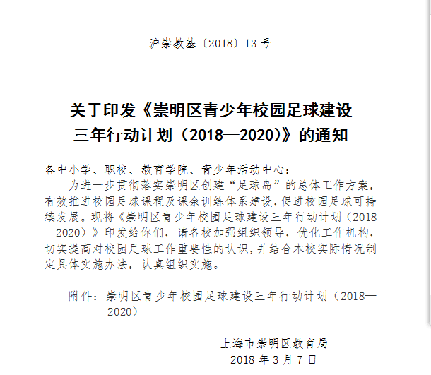 为推动该计划的实施,在2018年新学期进行了全区动员。组建崇明区东、西两部四个年龄段的青少年校园足球精英训练营,建立精英训练营涉训球员信息库,初步形成男女平衡发展、梯队建设合理的校园足球发展的架构。并从组织保障、思想保障和经费保障方面保障该计划的落实。