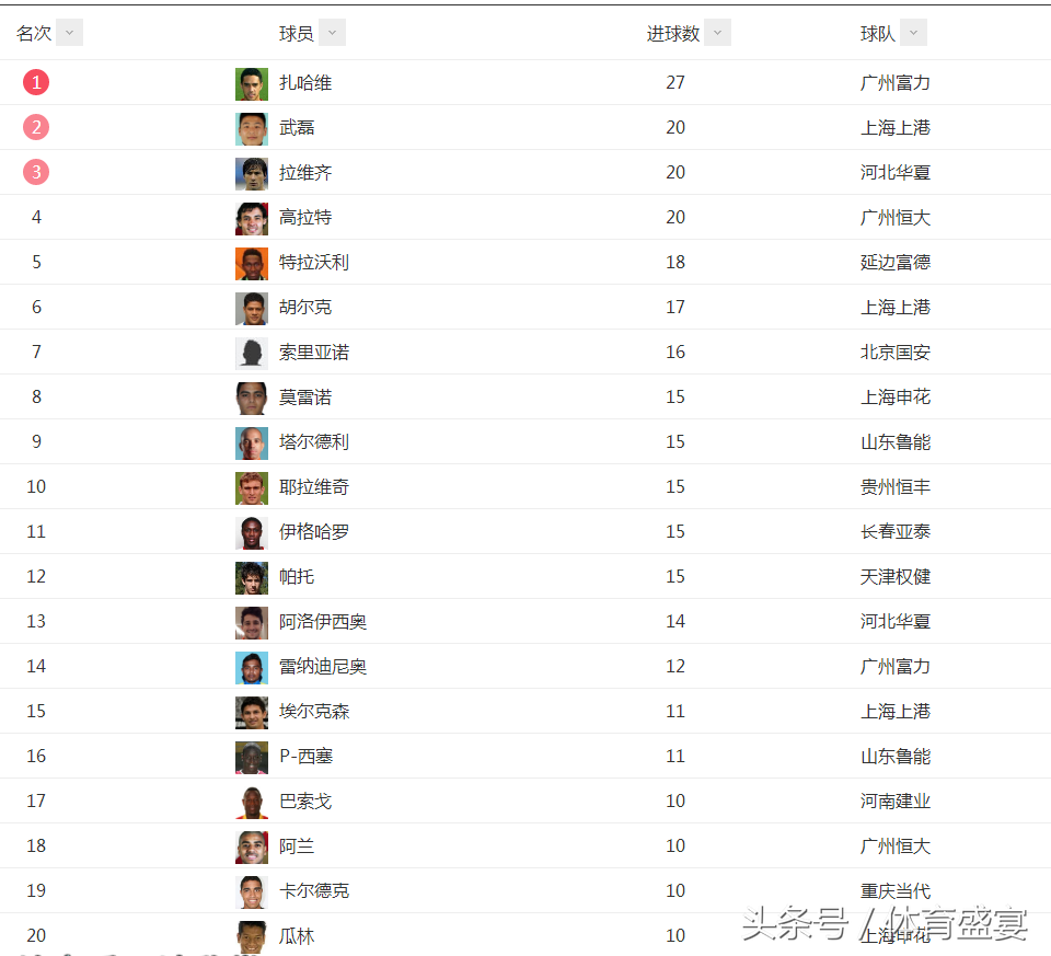 2017年中超联赛落幕了,现在让我们回顾一下这个赛季各球队的积分榜排名及各球队球员射手榜情况。